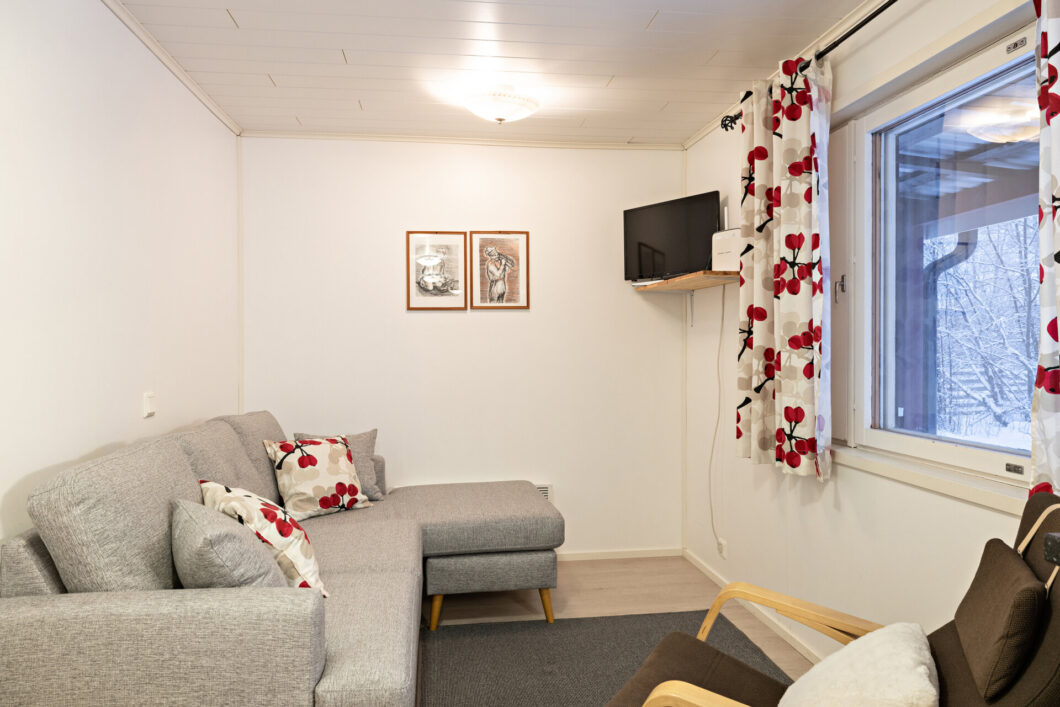 Arctic Cabin 4:n tilavat oleskelutilat tarjoavat mukavan ympäristön yhdessäoloon. Olohuoneessa voit rentoutua taulu-tv
